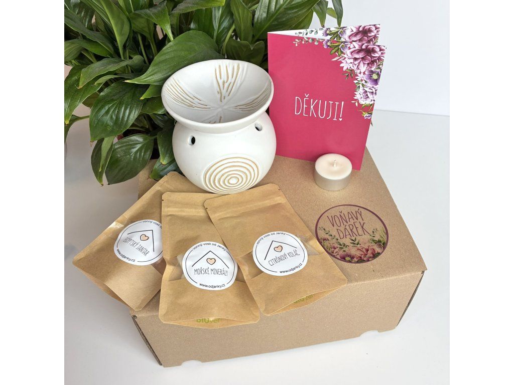 1. Dárkové balení vonných vosků, sojové čajové svíčky, aromalampy a přání.