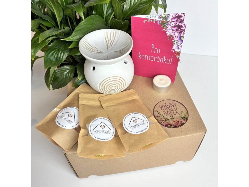 1. Dárkové balení vonných vosků, sojové čajové svíčky, aromalampy a přání.
