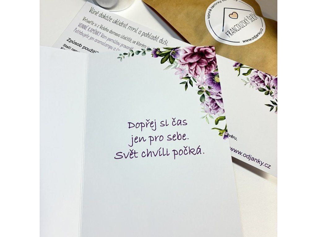 Text na vnitřní straně přání: Dopřej si čas jen pro sebe. Svět chvíli počká.
