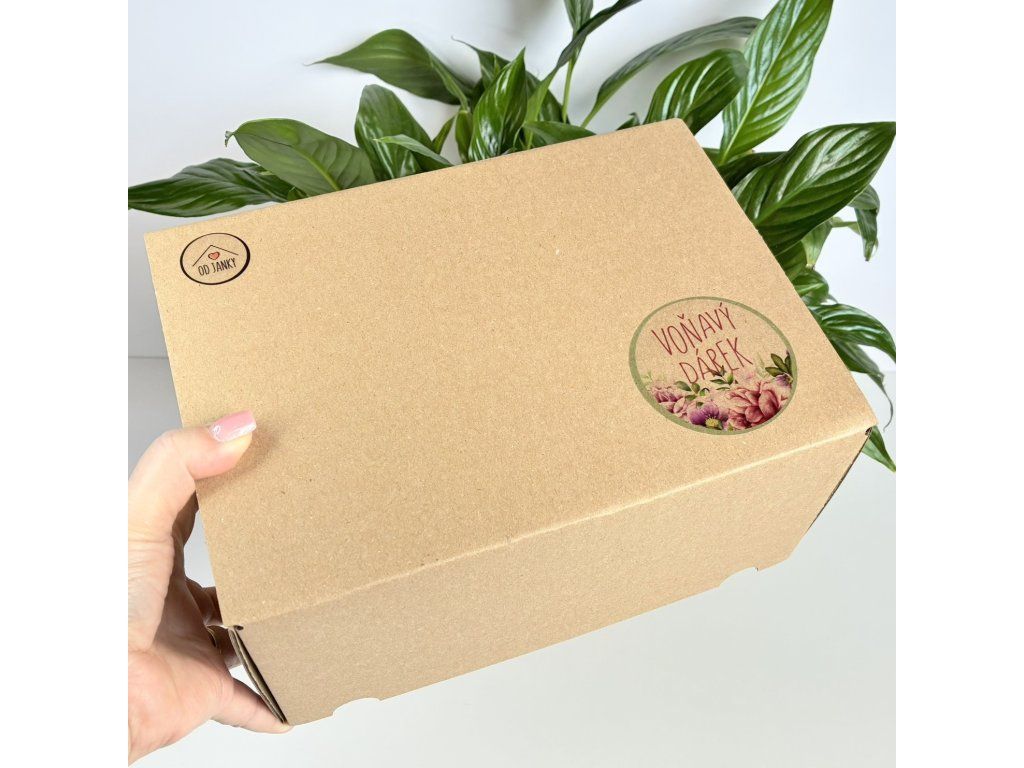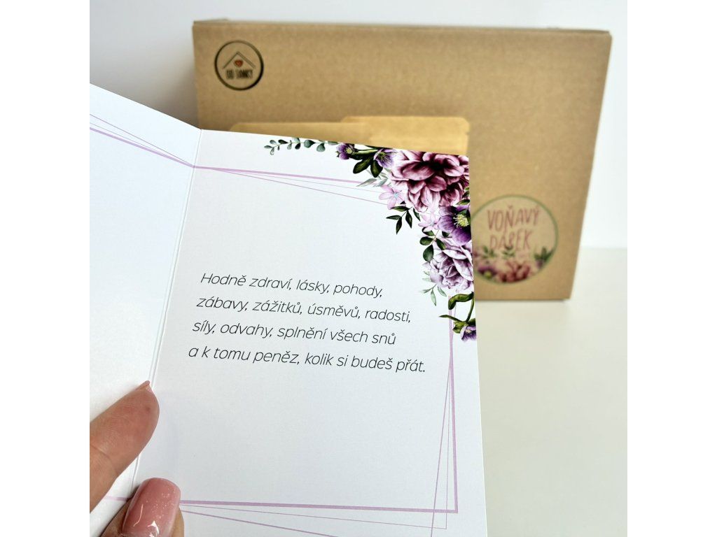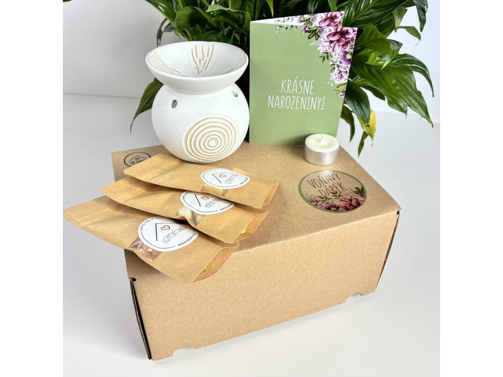 Dárkové balení 3 kusů vonných kamínků s návodem, sojové čajové svíčky, přání Krásné narozeniny! a aromalampy.