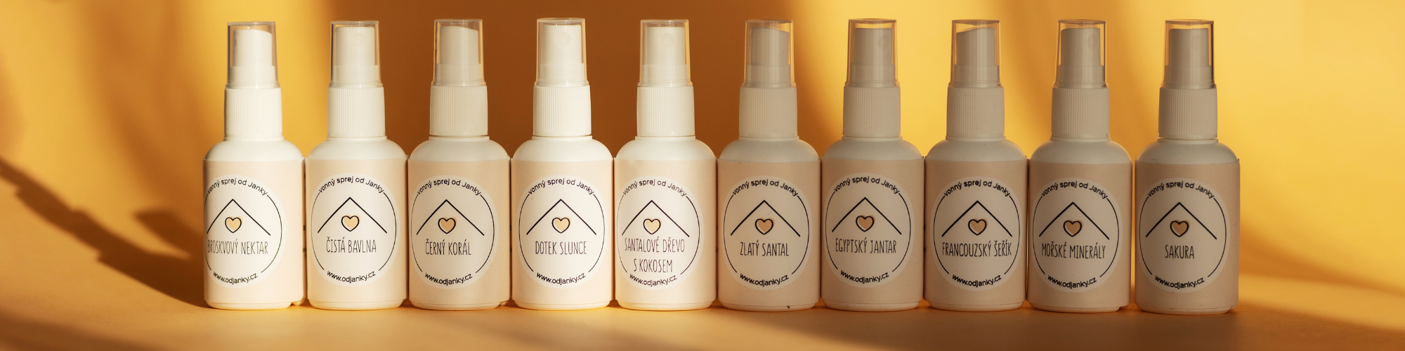 Vonné spreje od Janky = ekologicky šetrný, zdravotně nezávadný a rychlý způsob provonění prostor, nebo auta. Stačí 3 stříknutí do prostoru, nebo třeba na závěs, sedačku, kobereček v aute... Nezanechává stopy.